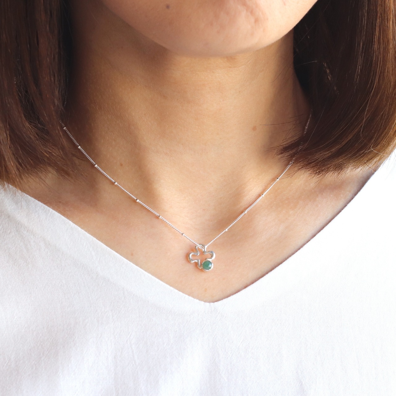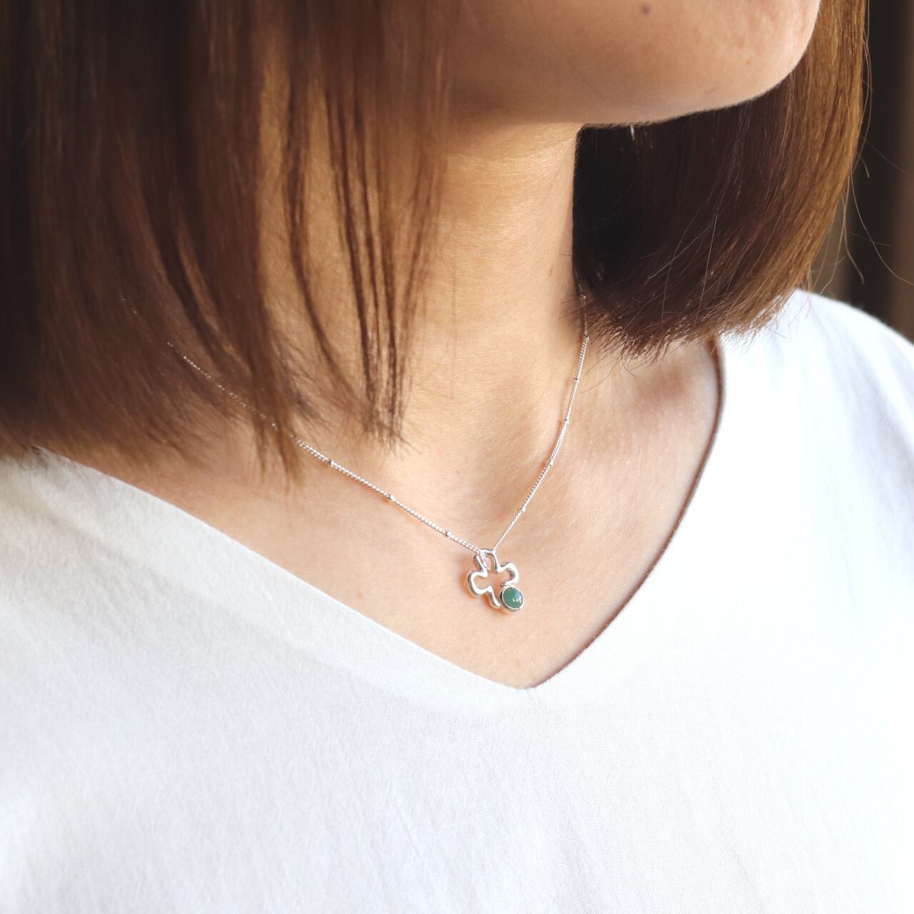 ぽわんと可愛らしいクローバーに糸魚川ひすいを添えてネックレスにしました。