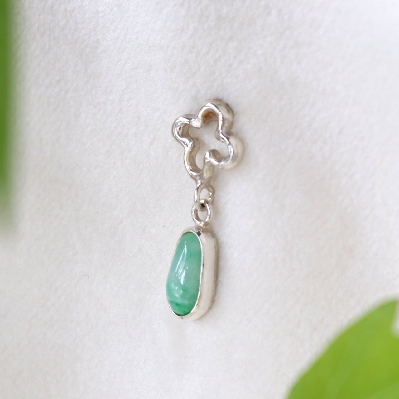 グリーンのグラデーションが美しい糸魚川ひすいを、オリジナルデザインの「ぽわんクローバー」にあわせてブローチに仕上げました。