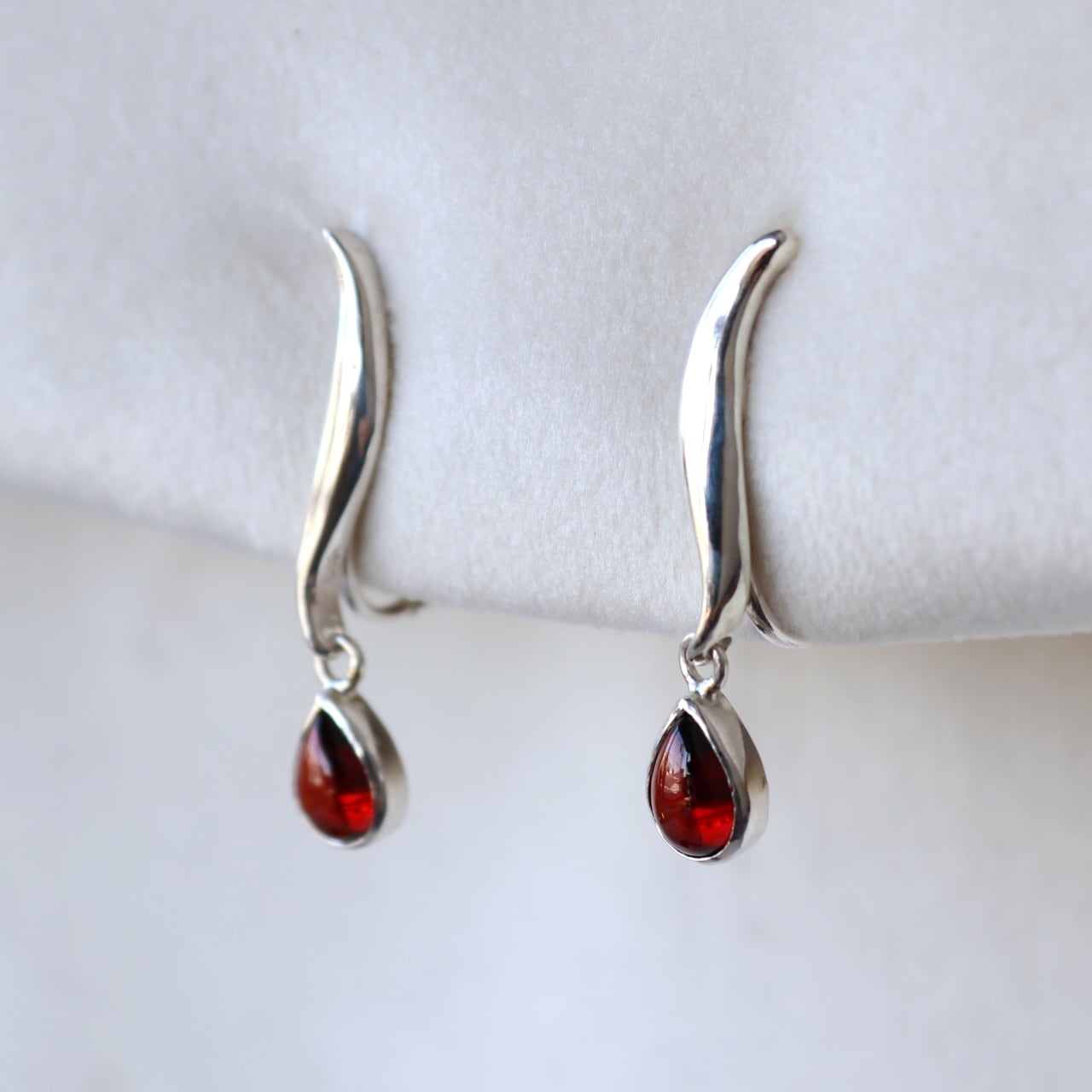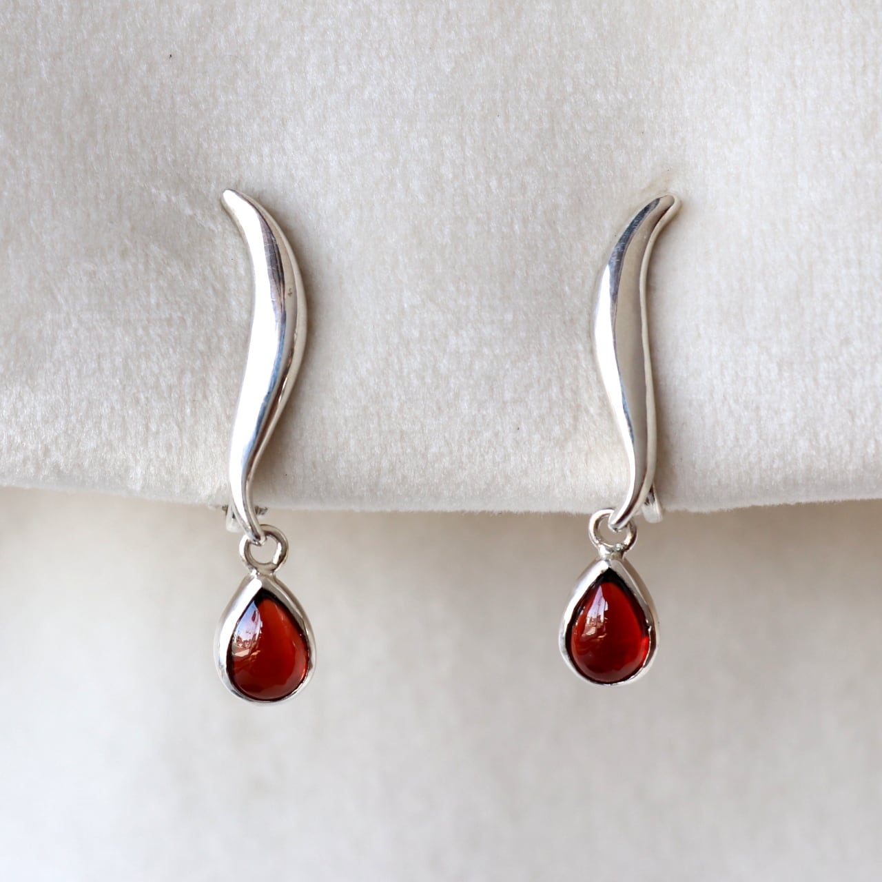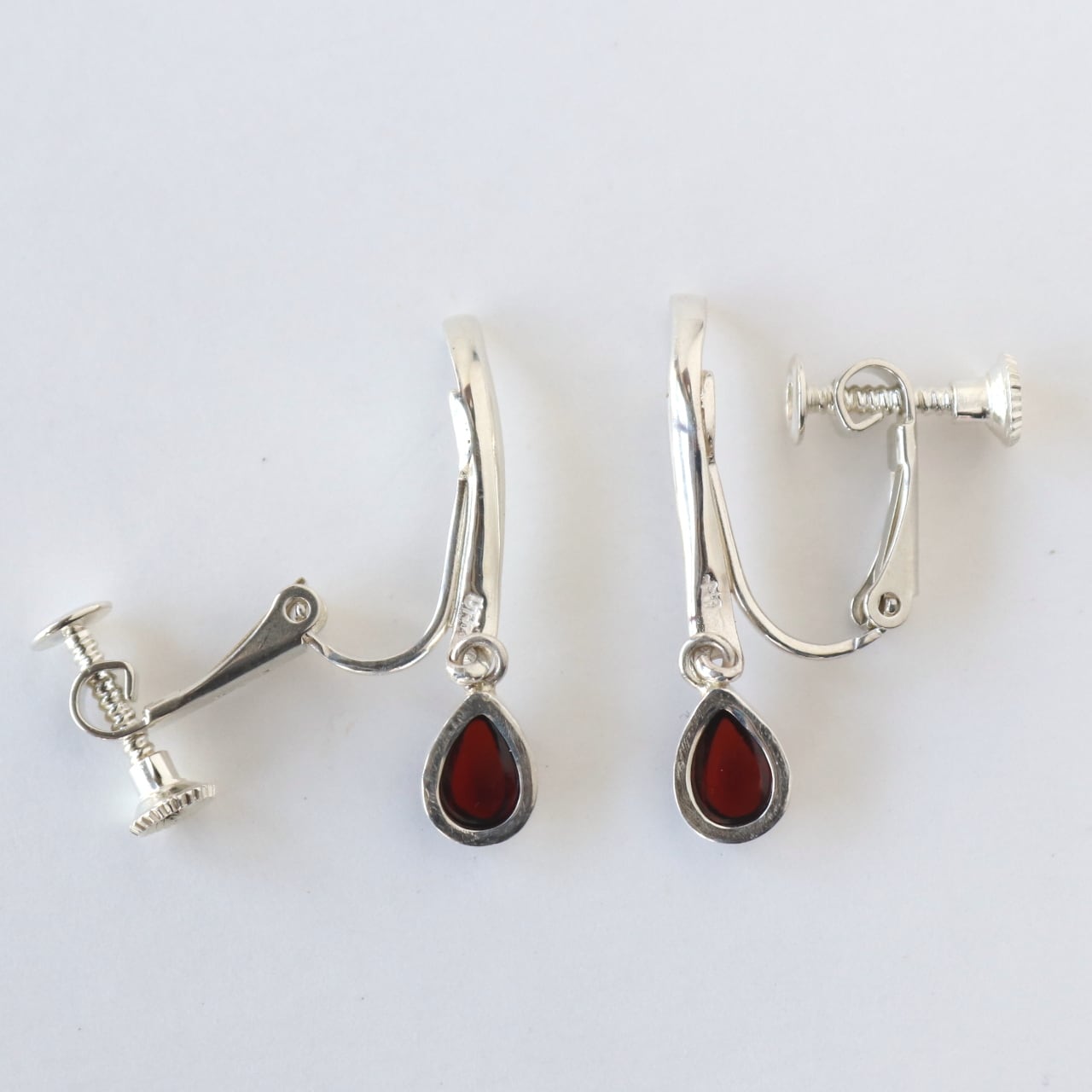 しずく形のガーネットが揺れ、目を引く一点です。