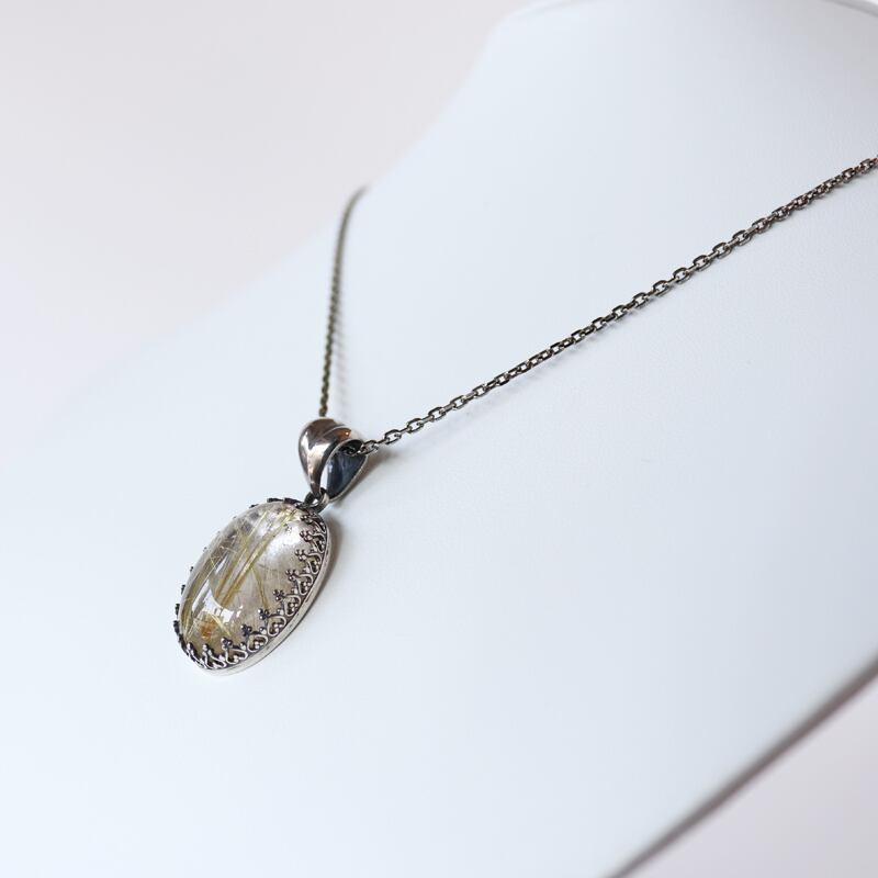 金色のルチルが美しいクオーツを、繊細なベゼルで囲んでペンダントに仕上げました。