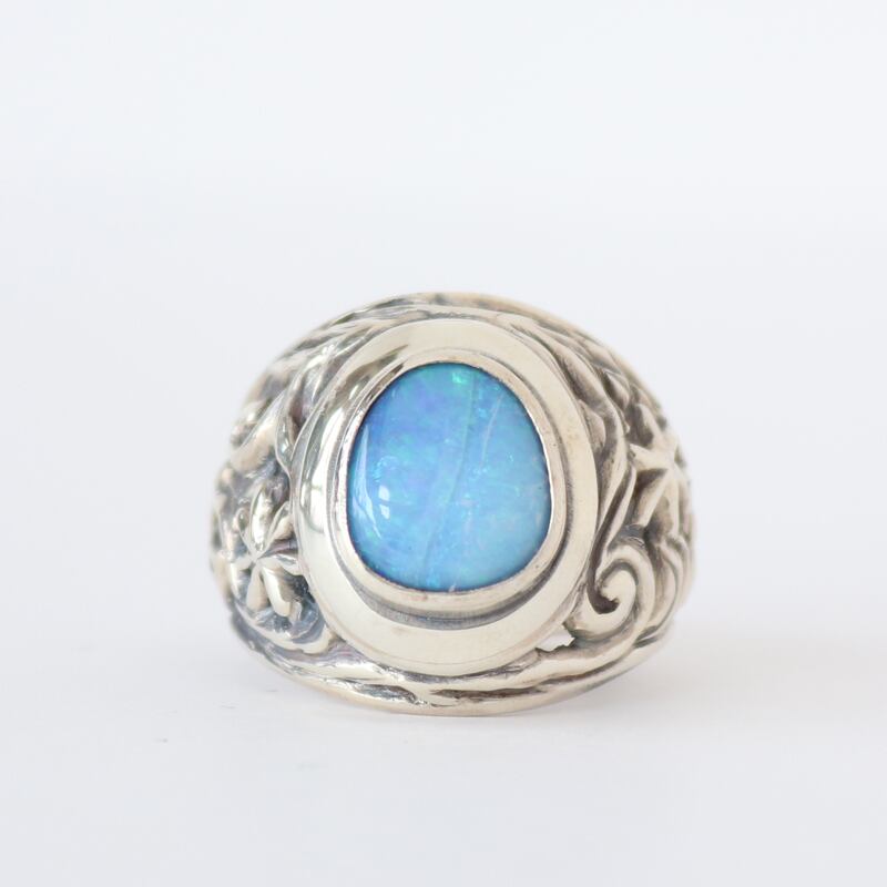 立体感のある植物模様に大きく発色の美しいボルダーオパールを合わせました。