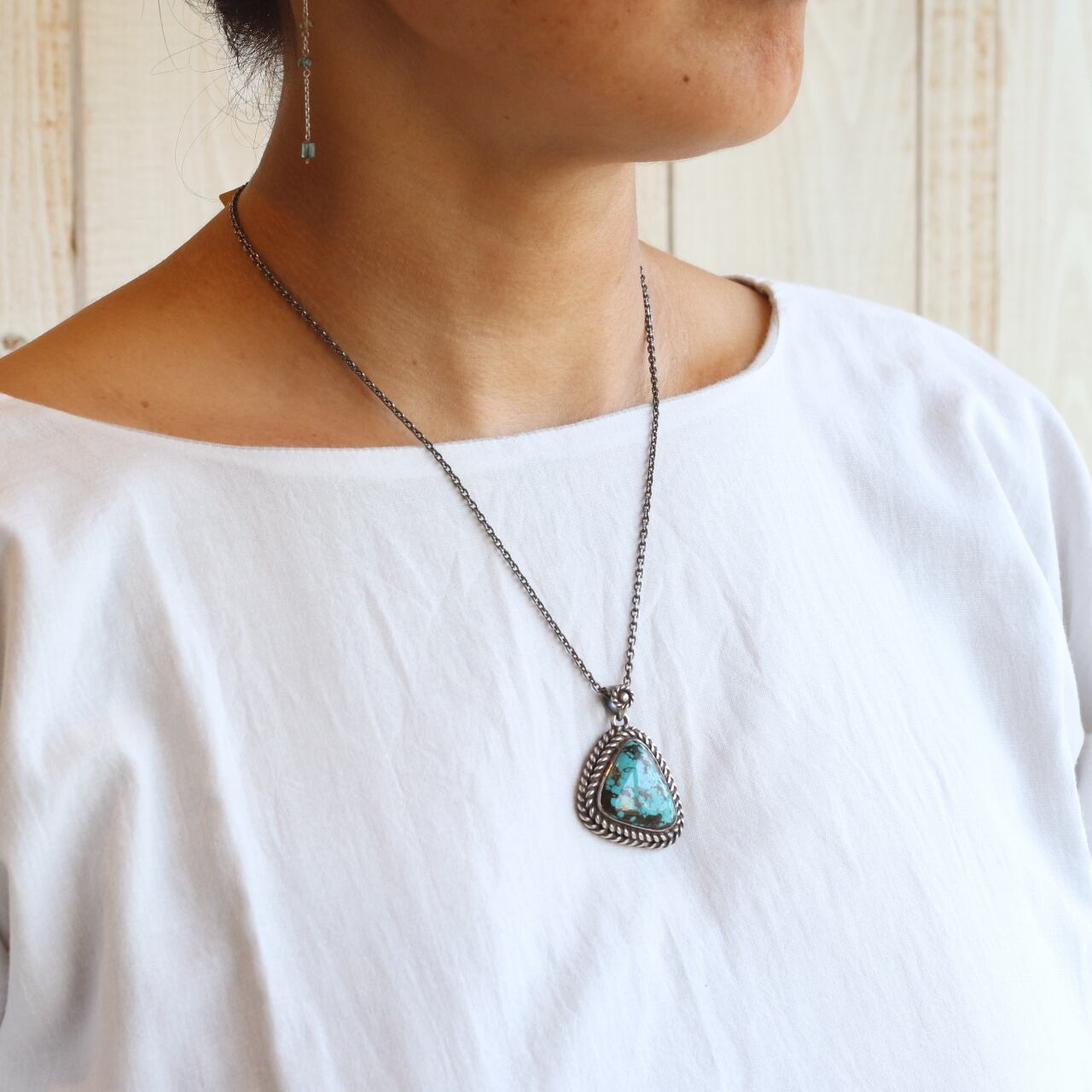 ブルーが美しく模様も形も個性的なターコイズを、伝統的なナバホスタイルでペンダントに仕上げました。
