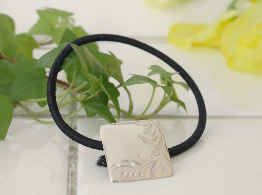 四角いシルバーに手作業で唐草の模様を彫り込みました。