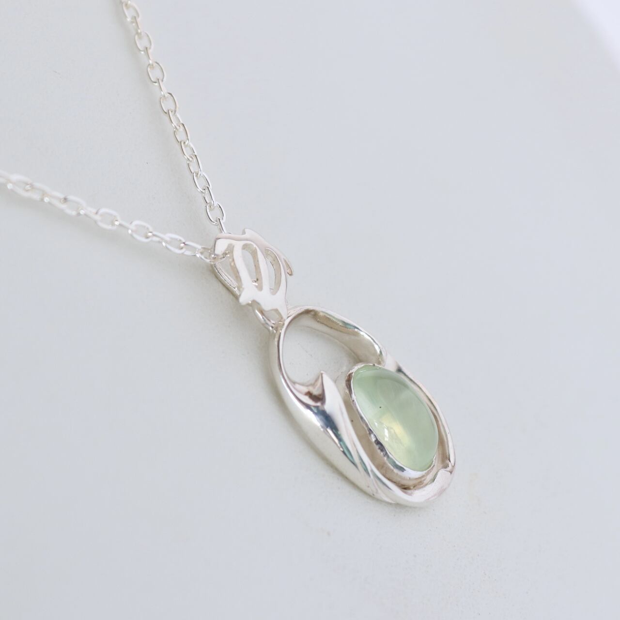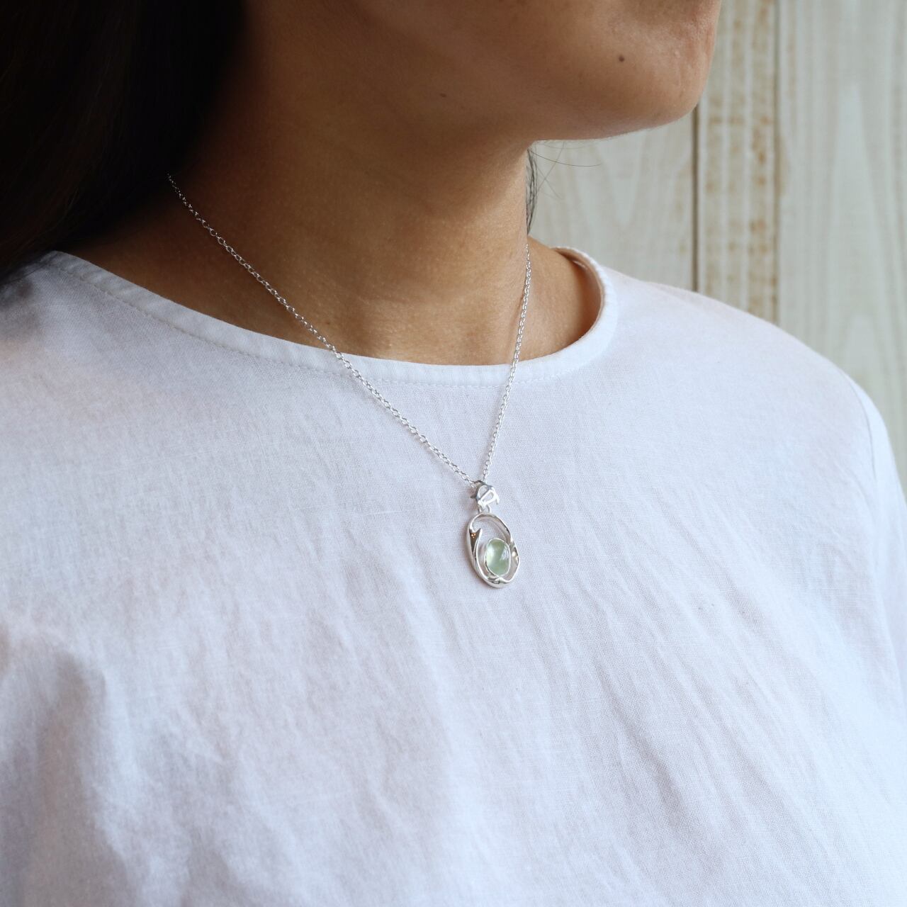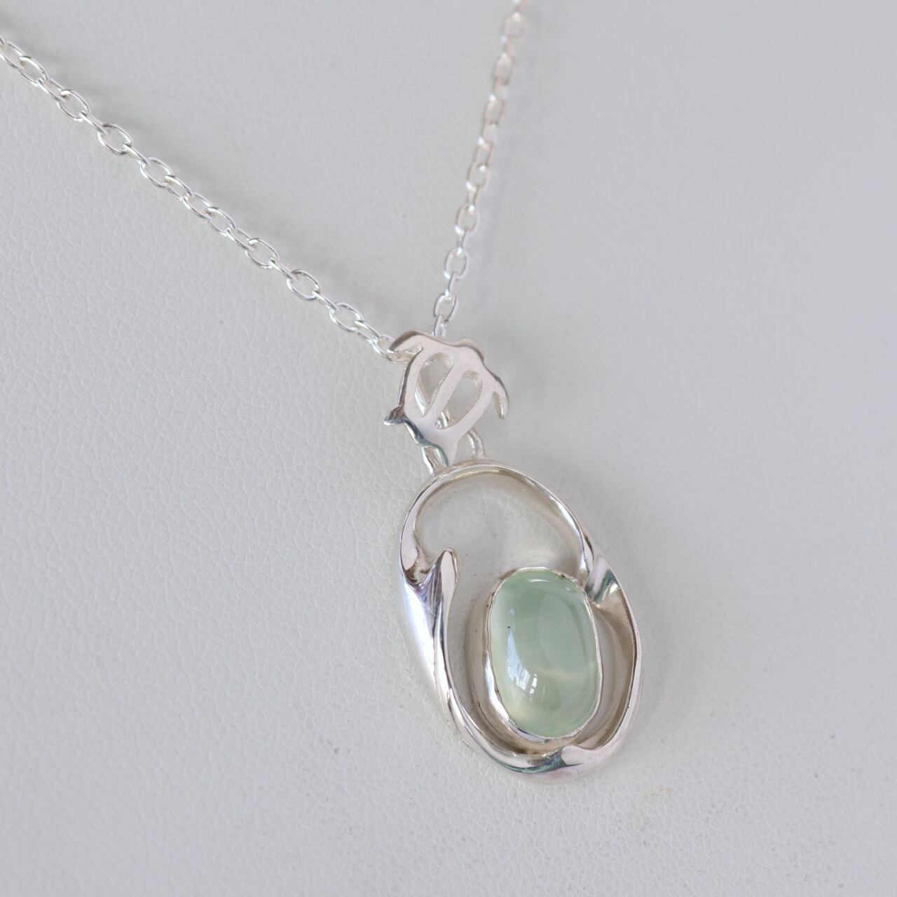 半透明のプレナイト(プレーナイト)を、波を思わせるオリジナルデザインのシルバーのサークルで囲みペンダントトップに。