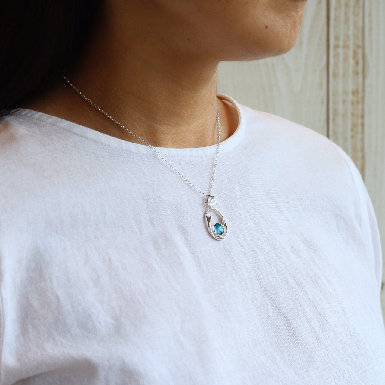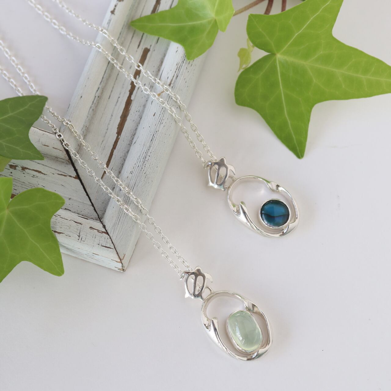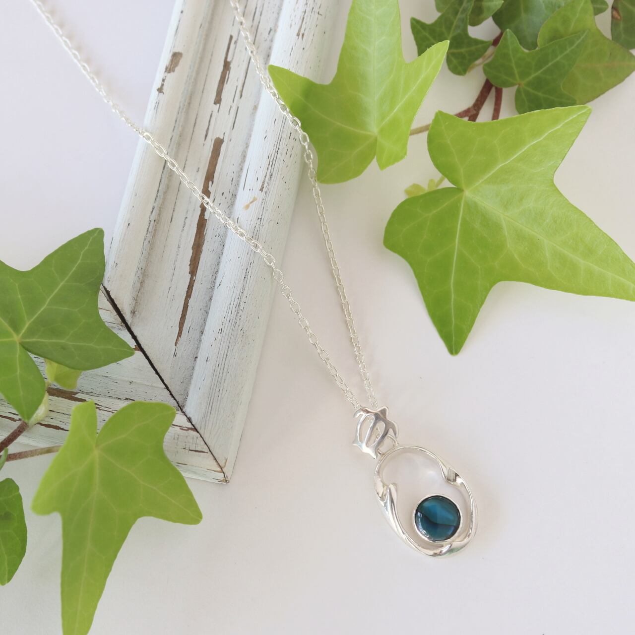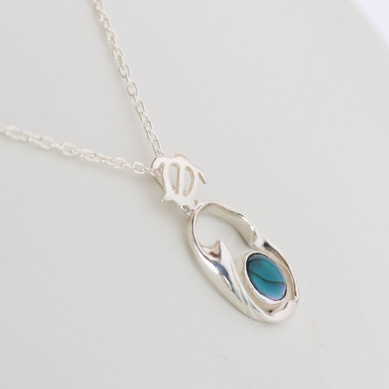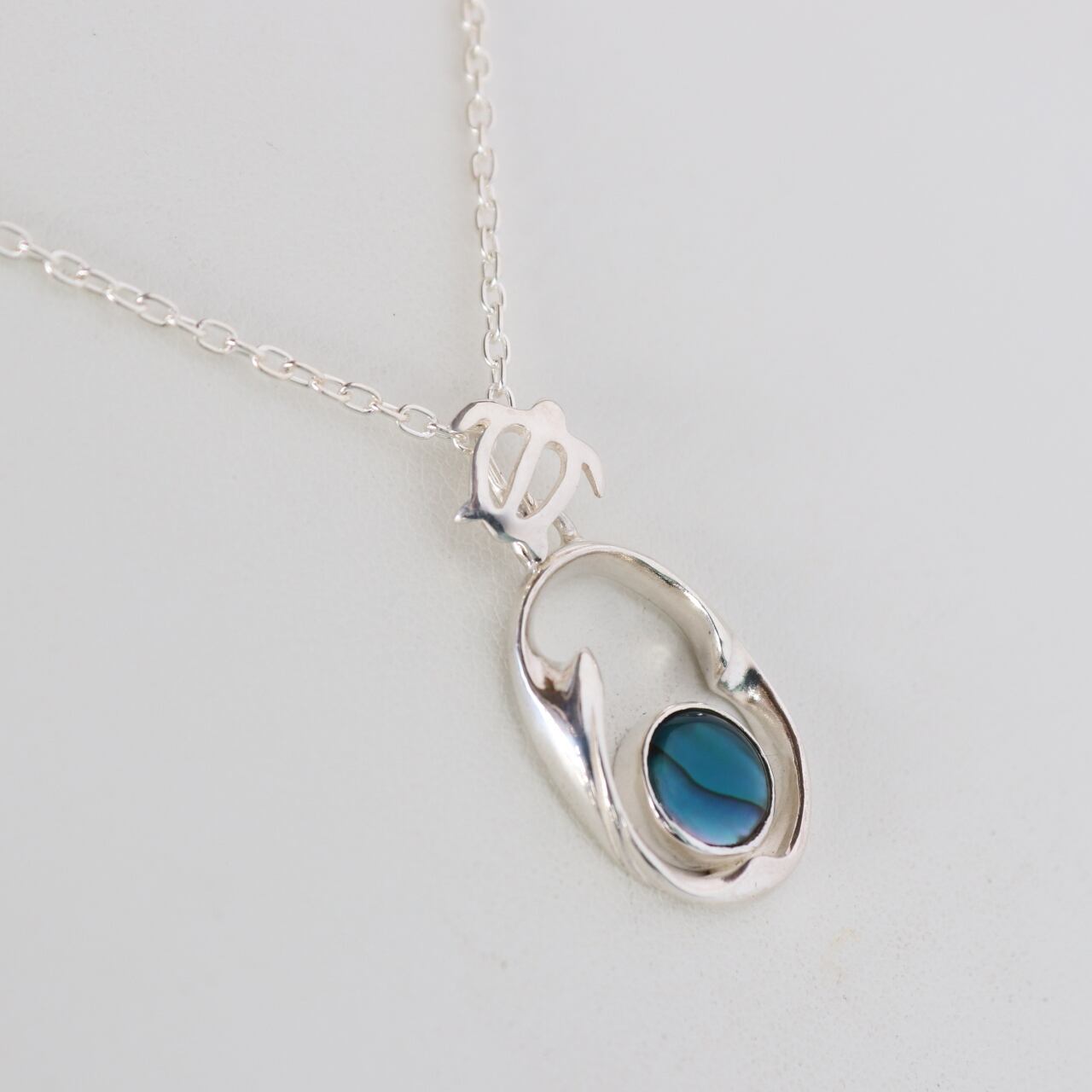 謎めいたきらめきが美しいアバロンシェルを、波を思わせるオリジナルデザインのシルバーのサークルで囲みペンダントトップに。