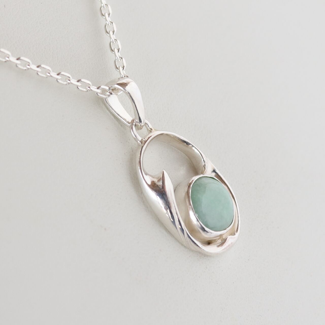 淡翠色の糸魚川ヒスイを、波を思わせるオリジナルデザインのシルバーのサークルで囲みペンダントトップにしました。