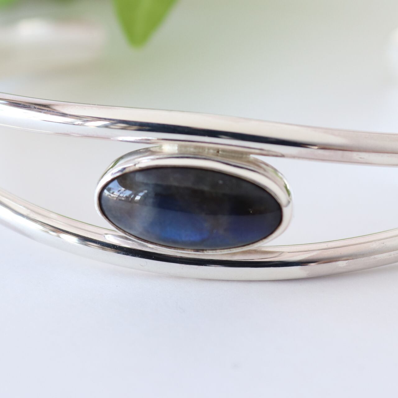 海のように深く輝くブルーのスペクトロライトをバングルに仕上げました。