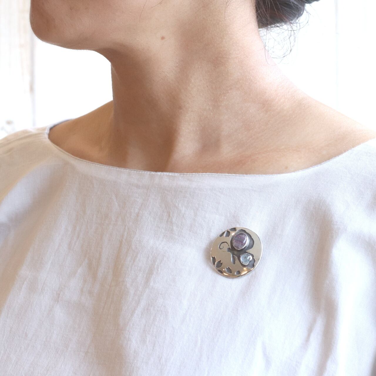 シルバーから蝶と桜を切り出し、蝶の羽部分に2石の天然石をはめ込みました。